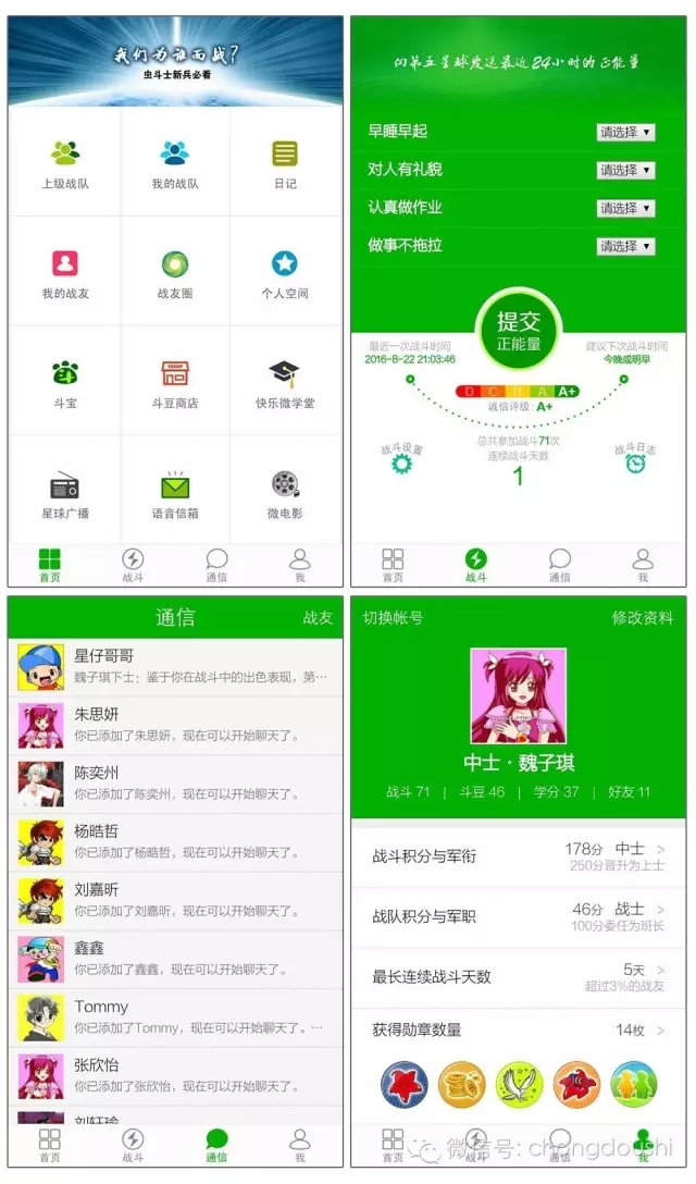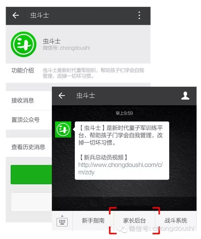 虫斗士战斗系统完成华丽升级,新系统堪称儿童版微信,界面更清爽,功能更强大。 新系统增加了家长管理后台,家长可以进行战斗设置、申请勋章、查看孩子的训练报告等。 家长管理后台进入方法:打开虫斗士微信公众号(chongdoushi),点下方菜单里的[家长后台](在战斗系统微信版入口的旁边) 除了原来的微信版以外,还有界面一致的APP版哦。查看APP的安装设置方法
